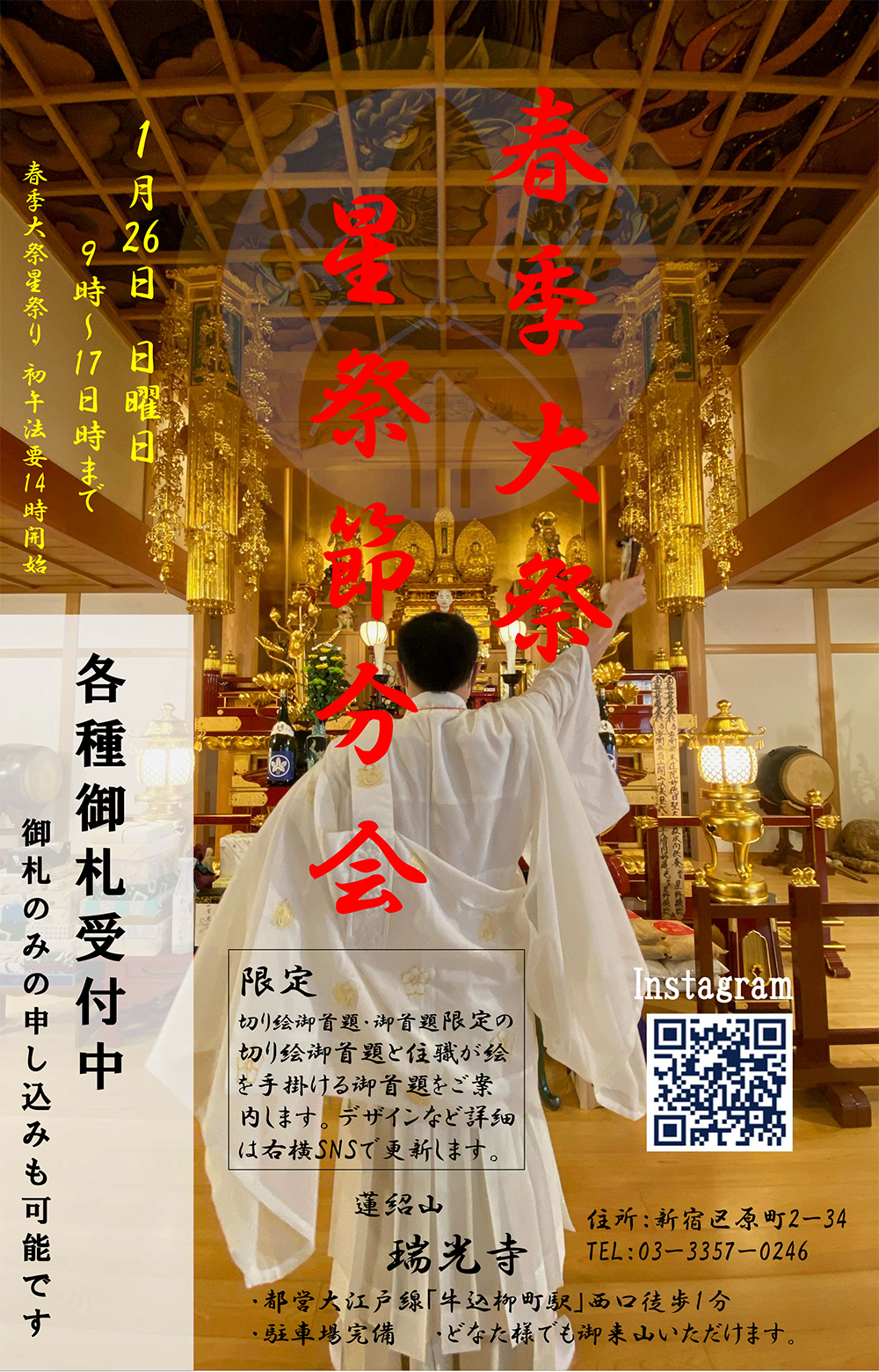 牛込庭苑がある瑞光寺では、来る1月26日(日)に「春季大祭星祭節分会」を開催いたします。