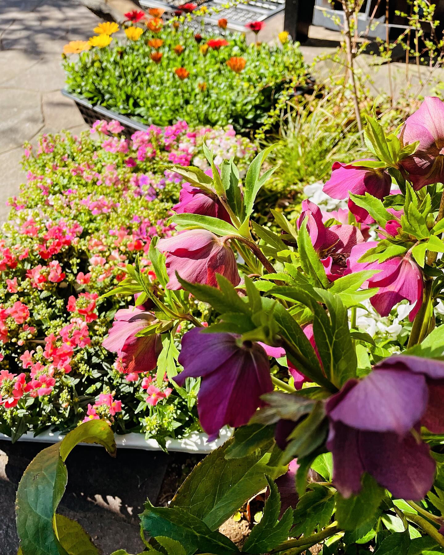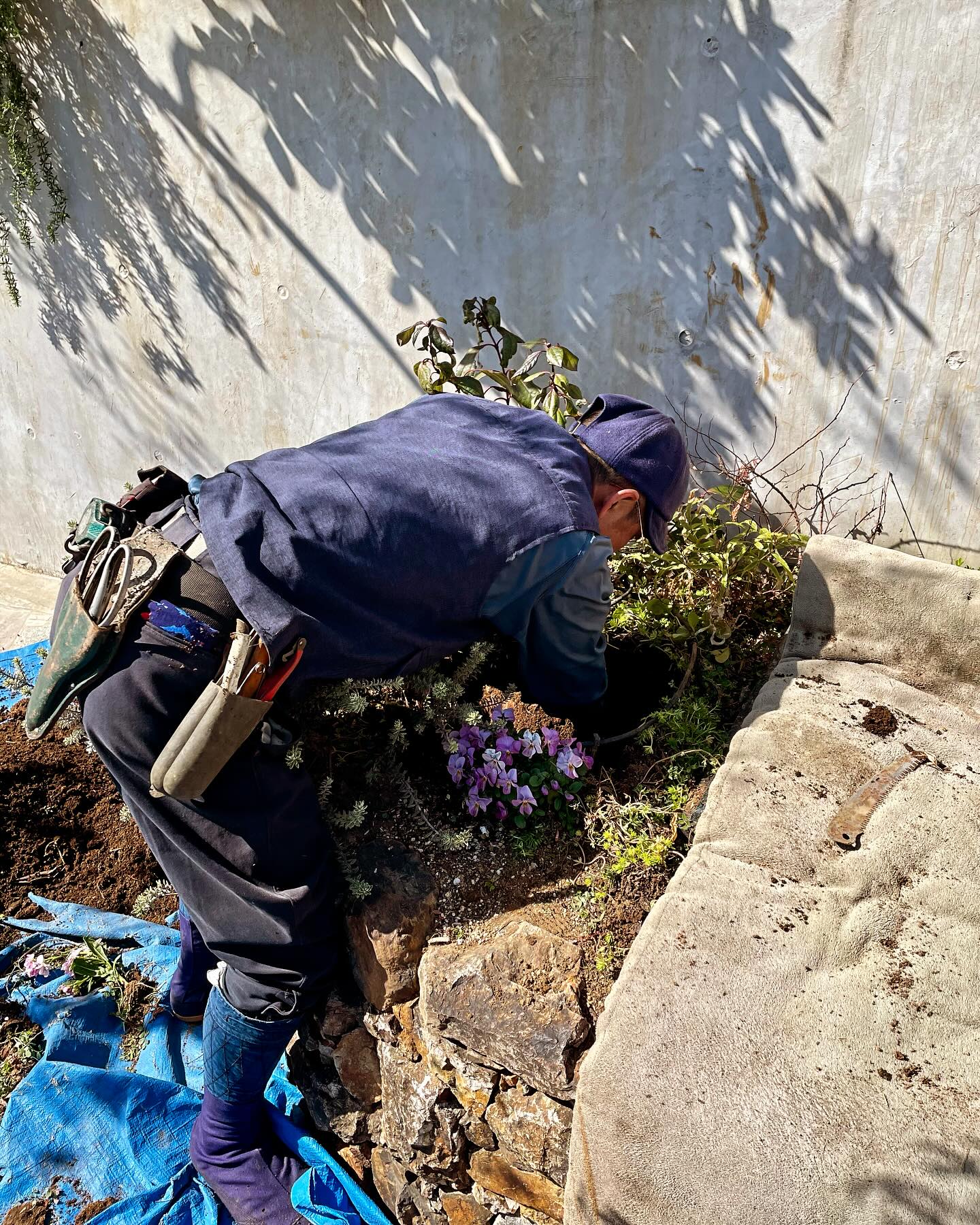青空が広がる牛込庭苑では、春の花の植え替えが始まりました。